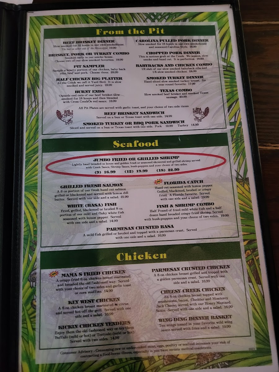 Lightly breaded and golden fried or seasoned skewered and grilled shrimp served with Creek sauce, shrimp sauce, hush puppies and your choice of two sides